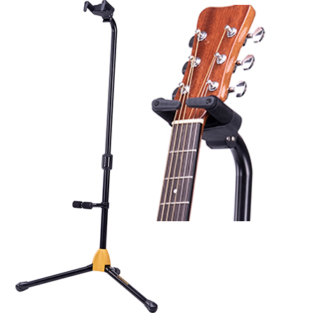The Hercules GS412B high quality guitar stand with Auto Grab System will accommodate electric, acoustic and bass guitars and even unusual shape guitars like a Flying V or many of the more wacky B.C. Rich shapes.